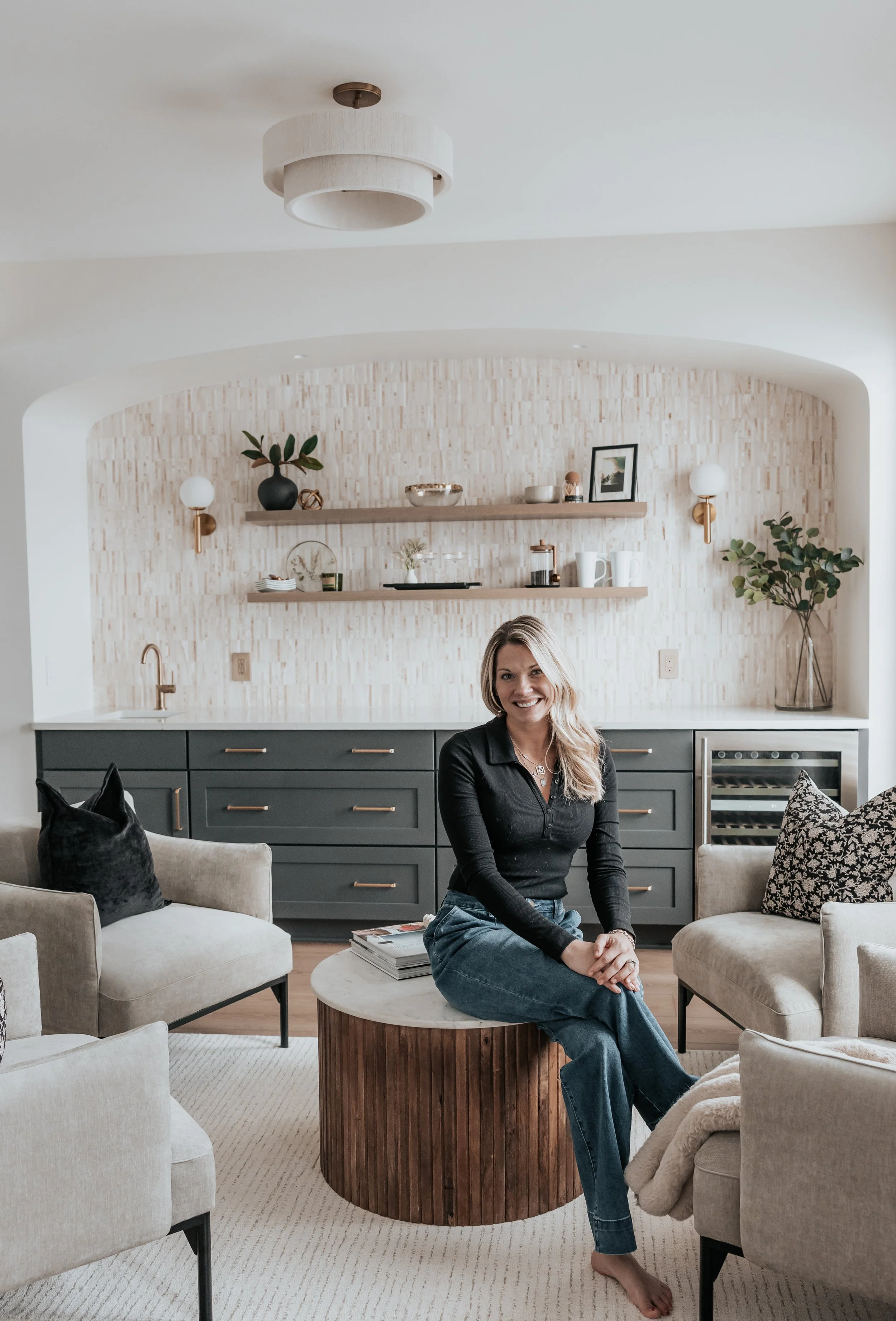 Meagan's vision extended beyond just the kitchen. The once underutilized dining area was transformed into a stunning sunken bar and lounge area, featuring an elegant arch that creates a seamless flow between the spaces. This intentional design not only maximizes the functionality of the first floor but also adds a touch of sophistication that aligns with her taste.