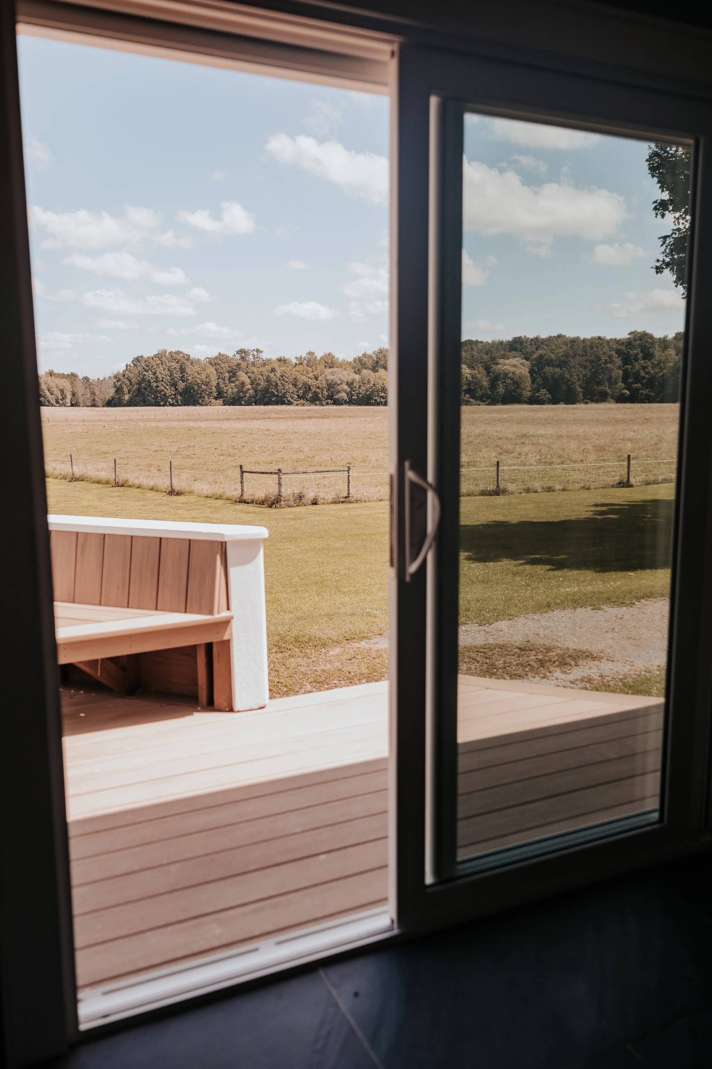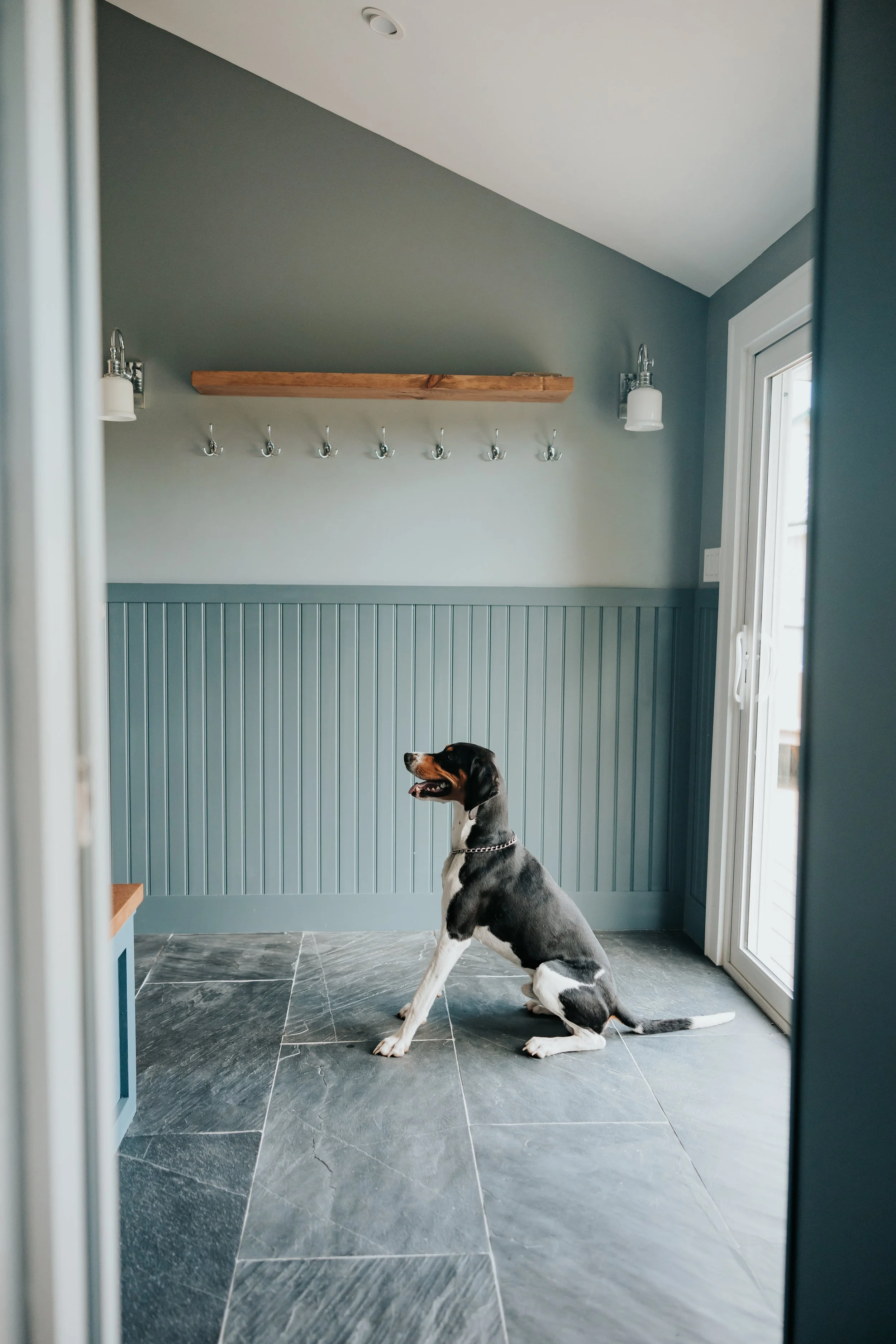 The prior space was very dark and not fully functional for a working farm. The client wanted more light and a very durable tile floor that could withstand lots of wear & tear. So we removed their narrow door and window and added a glass sliding door and selected 24x36 inch slabs of slate tile for their floor. And added lots of open shelving for muddy boots & shoes as well as closed cabinets for supplies.